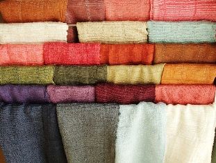 写真左、草色のざっくりした風合いが「コットンとエリシルクの織り」、茶系のエレガントな右が「エリシルクだけの織り」、キャシーさんのシルクはすべて草木染めです。写真では見ずらいですが、ポンチョの首周りには、手縫いのビーズもちりばめられています。