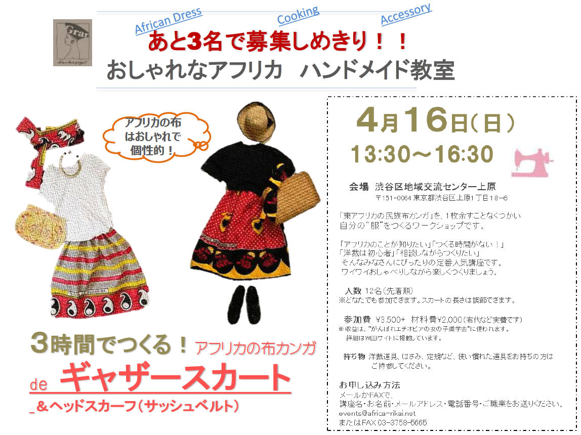 「おしゃれなアフリカ ハンドメイド教室:3時間で作るアフリカ布カンガ de ギャザースカート&ヘッドスカーフ」