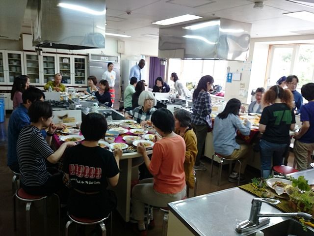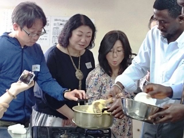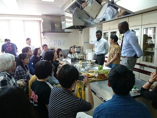 コンゴ人講師のお二人もびっくりするほどおいしくできたお料理をみんなで試食。各テーブルは、参加者同士で、あるいは講師やスタッフを囲んで様々なお話しをしながら時間を忘れて楽しんでいました。ほかのコンゴでおすすめの料理を講師に聞いれみました。魚の燻製(湖・川でたくさん獲れ、種類が多い)、ポンデュ(キャッサバのスープ)がおすすめだそうです。