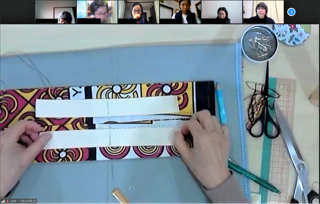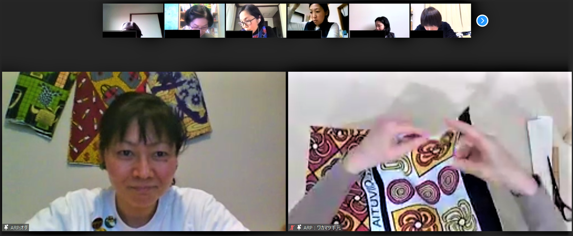 今回は、「手しごとからみるアフリカ」と題し、第一部アフリカの布のお話・第二部エコランチバックづくりを行いました。第一部の講義では、事前に参加者に布のサンプルを送付し、実物に触れながらの講義に、第二部では、手ぬいで1時間程度で完成できる『エコバックづくり』に挑戦しました。聴講だけではなく、参加するオンライン講座を工夫しました。