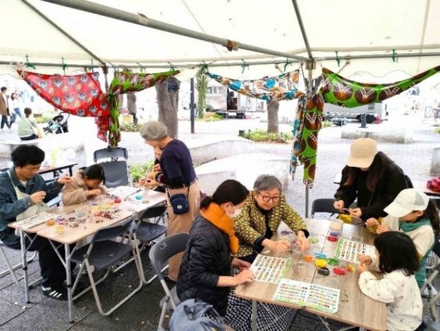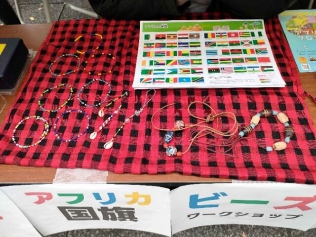 2日目のアフリカ国旗ビーズワーク。この日は有料(材料費)でしたが、お子さん連れの家族など、朝から夕方まで参加者が途切れることがありませんでした。